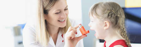 Pediatrician doctor teaching little girl to use hormonal inhaler in clinic