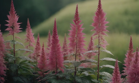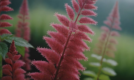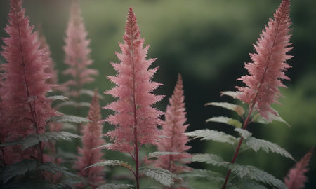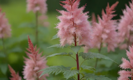 Vibrant pink Astilbe flowers bloom in a lush garden setting. The close-up captures the delicate petals and foliage with a soft bokeh background. Perfect for articles on gardening or summer flowers