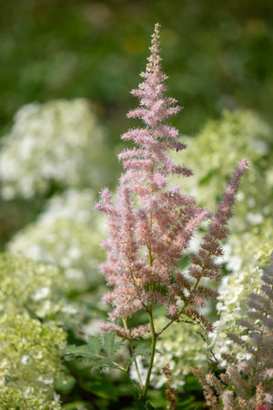 Astilbe flowers blooming in summer. Selective focus and shallow depth of field.