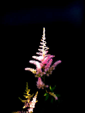 Pink astilbe flowers in the garden at sunset. Selective focus.