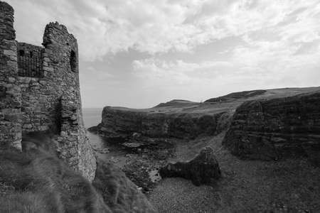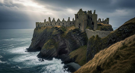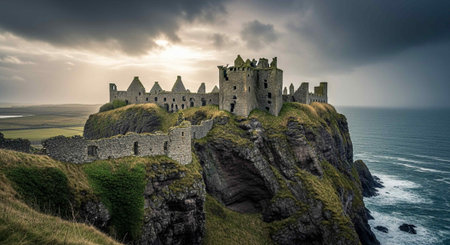 Panoramic view of the ruins of Dunluce Castle in Northern Ireland at sunrise. Historic place