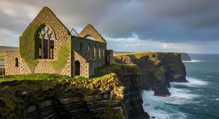 Epic Aerial Scenic Irish Castle landscape view from Doolin in County Clare. Famous tourist attraction along the wild atlantic way Ireland. Aran islands coastal beach in the distance.