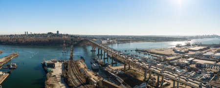 Aerial panoramic view of an Industrial Site and Second Narrows Bridge during a sunny summer day. Taken in North Vancouver, British Columbia, Canada.