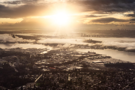 Aerial view of a modern city on the pacific northwest. Dramatic Colorful Sunrise Sky. Taken in North Vancouver, British Columbia, Canada.