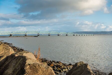 Arched sectional bridge with different height and design spans across the estuary of the Columbia River in Astoria on Pacific Ocean for the passage of ships under the raised section of the bridge installed on high stilts farms.