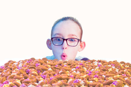 Young man surrounded by flying lightbulbs. Conceptual image.