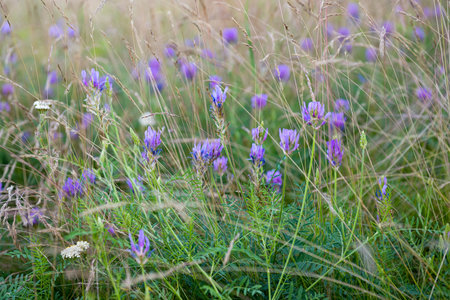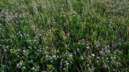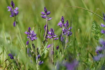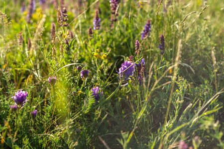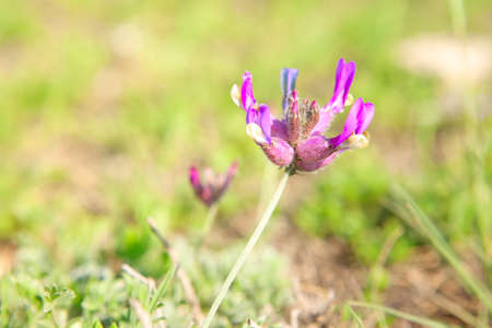 Purple flowers of goat's-thorn (Astragalus onobrychis) shot close-up on the ground among other herbs