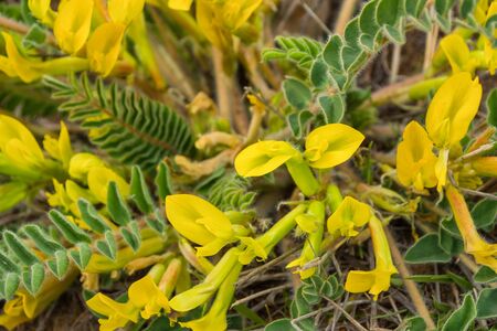Yellow flowers of woolly-flowered Astragalus (Astragalus dasyanthus). Medicinal plant close-up. Selective soft focus.
