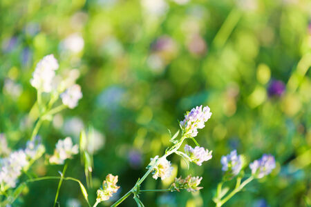 Stems of alfalfa with blossomed flowers and flower buds on field on a blurred background, close-up at selective focus
