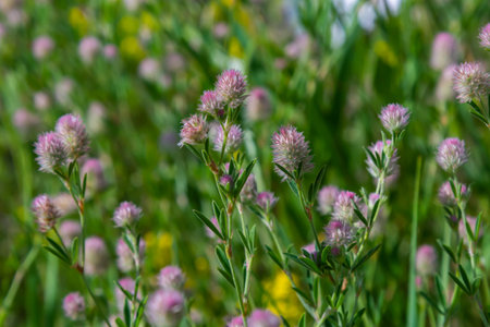 Closeup of flowering Rabbitfoot clover or Trifolium arvense in its on wild habitat on a sunny day in the Dutch summer season.