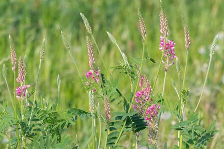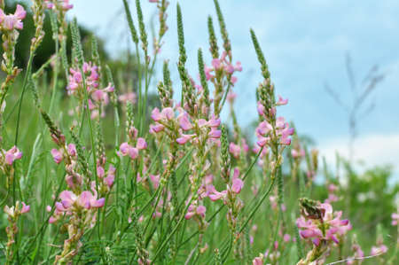In the meadow among wild grasses blooms sainfoin (onobrychis).