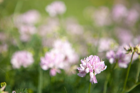 Purple crown vetch, Securigera varia meadow flowers closeup selective focus