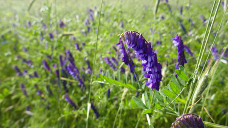 A close-up of Vicia cracca displays its striking purple flowers among lush green foliage thriving in a meadow environment during late spring sunshine.