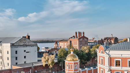 Samara, Russia - October 8, 2025: Scenic view over historic district. Golden dome of Iversky Convent and red-brick buildings of old Zhigulevsky Brewery near Volga River.