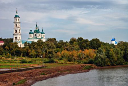 View of the Volga, the Temple of Simeon the Stylite in the Kremlin. Nizhny Novgorod, Russia.