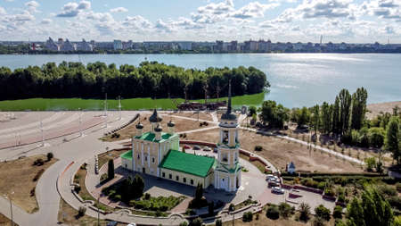 Evening summer Voronezh, Annunciation Cathedral, aerial drone view.