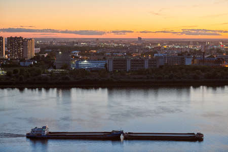 Nizhny Novgorod, Russia - 08.21.2020 - Nizhny Novgorod cityscape sunset. Beautiful scenic evening time over city skyline. Colorful sundown. Clear calm weather at dusk