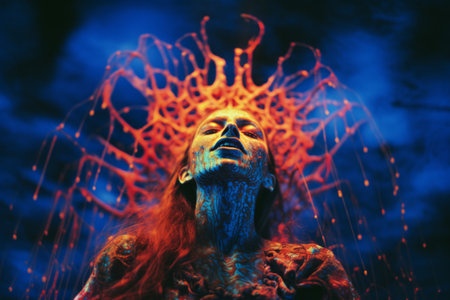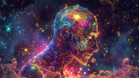A human-like figure is depicted in a striking array of vibrant colors, pulsating with energy and light. This artwork conveys themes of connection and creativity through its intricate patterns.