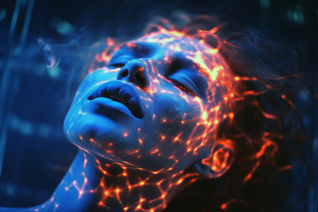 A young man's face glows with colorful lights, symbolizing digital neural connections in a captivating display.