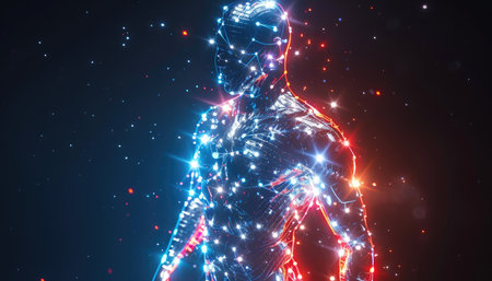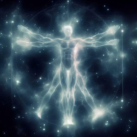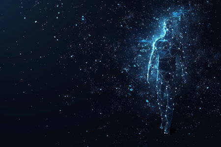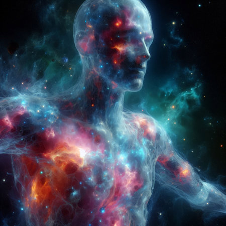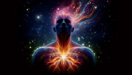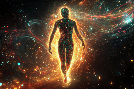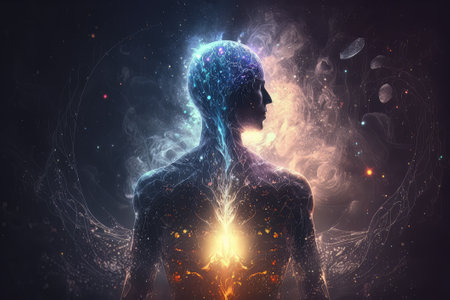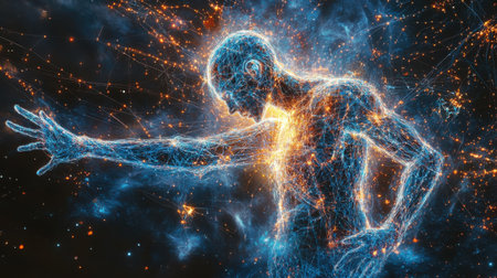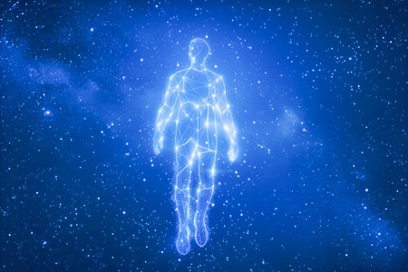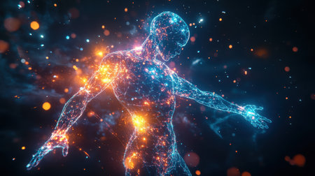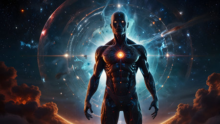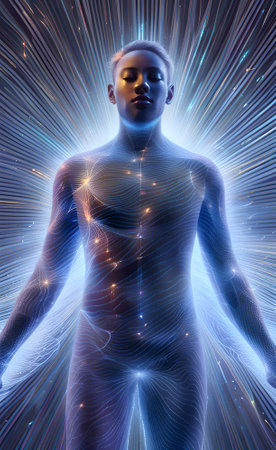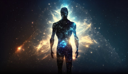 Fractal illustration of human body with glowing energy and stars background