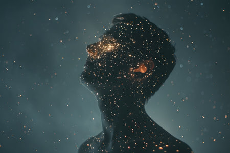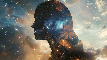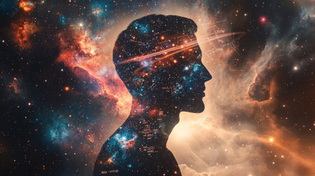 A silhouette of a human profile against a cosmic starfield, visualizing the concept of the universe within us.