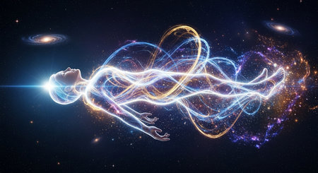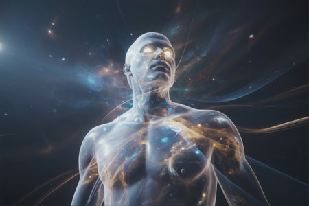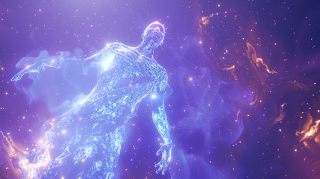 A futuristic depiction of a translucent human figure radiating light and energy amidst swirling cosmic dust and distant celestial bodies, evoking a sense of advanced technology and the vastness of space.