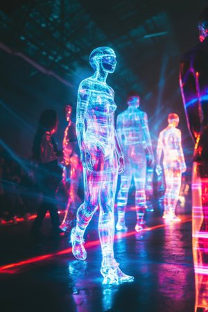 A stunning futuristic concert performance featuring captivating digital holograms pulsating neon lights and mesmerizing luminescent visuals that transport the audience into a visionary