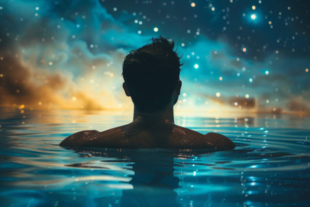 Translucent man figure with galaxy inside standing in water. Spiritual awakening and cosmic connection concept for meditation and relaxation.