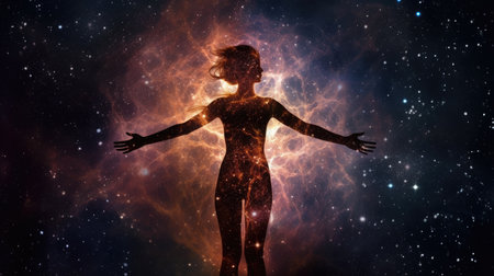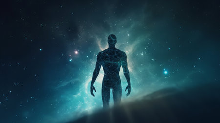 Human body with glowing nebula and stars. science fiction illustration. The concept of God in the image of a man against the background of the universe. Generative AI.