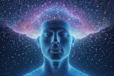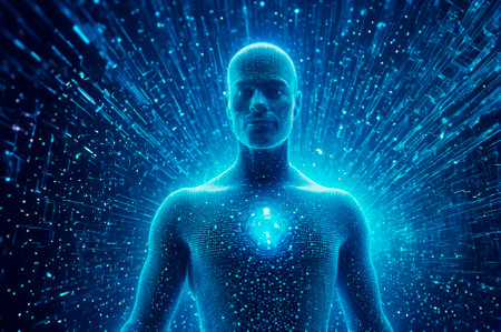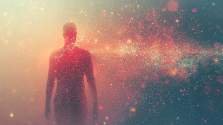A human silhouette made entirely of swirling data stands against a vibrant cosmic backdrop. This scene captures the essence of technology merging with humanity