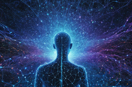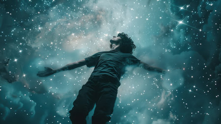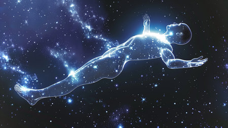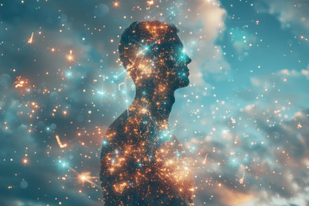 A mans body is encompassed by dynamic lines and twinkling stars, creating a surreal and ethereal scene of interconnectedness.