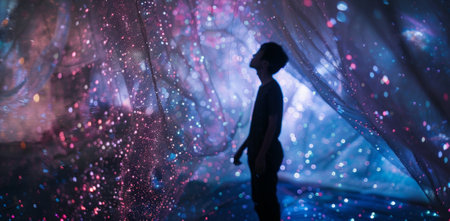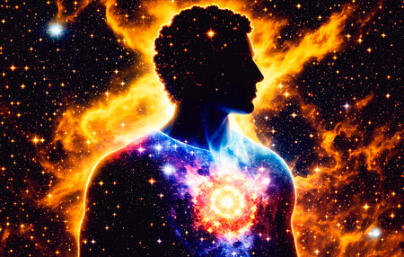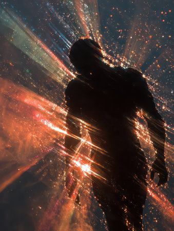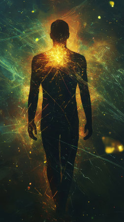 A man's silhouette emerges with a glowing core against a rich cosmic background. The mysterious surroundings evoke a sense of wonder and depth during twilight hours.
