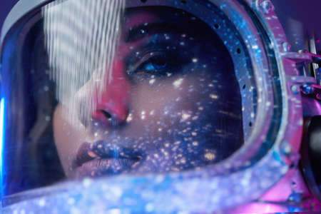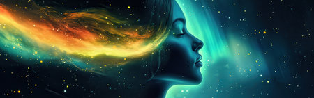 A woman's face emerges in a mystical style, seamlessly connected to swirling cosmic colors and stars, evoking a sense of wonder and exploration in a vast universe.