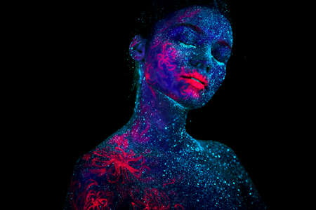 Fashion model woman in neon light, portrait of a beautiful model with fluorescent makeup, artistic design. Cosplay for the movie Avatar. The girl is an avatar
