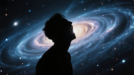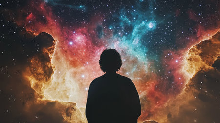 A breathtaking view of the galaxy with colorful nebulae and stars, as a silhouette gazes into the vastness of the cosmos
