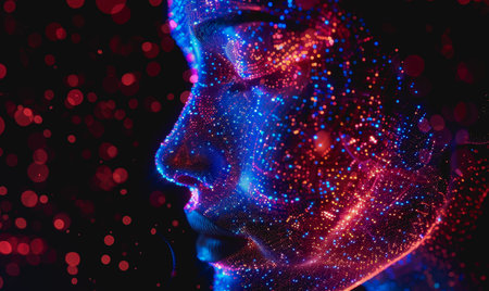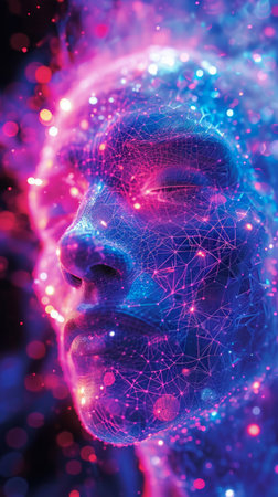 Futuristic digital face with neon lights, flowing data streams, glowing particles, high-tech aesthetic.