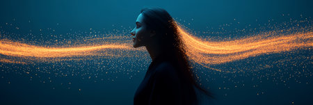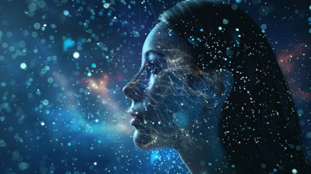 Abstract Profile Portrait Of A Woman With Flowing Digital Particles, Futuristic Digital Illustration