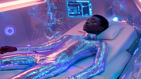 Futuristic medical pod. A young woman in a glowing silver bodysuit lies in a sleek, illuminated pod with technical data on a screen, evoking a sci-fi aesthetic.
