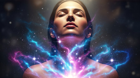 Woman with serene expression, enveloped in swirling cosmic colors and light, creating an enchanting ambiance that evokes feelings of tranquility and wonder
