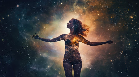 Woman silhouette in space with stars and nebula. The concept of God in the image of a female against the background of the universe. Generative AI