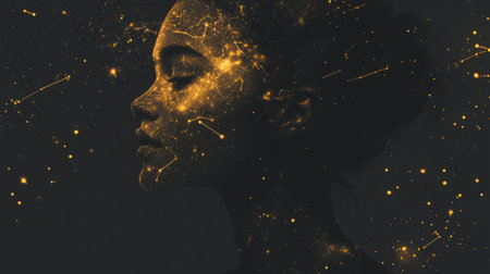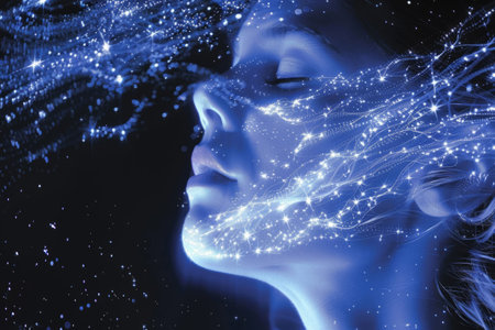 A woman with closed eyes exudes a tranquil presence, her face adorned with shimmering cosmic patterns that suggest a connection to the universe. The ambiance is ethereal and calming.