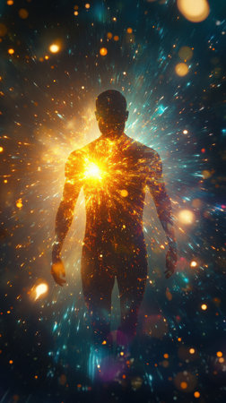 A glowing silhouette of a man stands amidst a burst of cosmic energy, symbolizing illumination and vitality. The background features swirling colors that evoke a sense of wonder and possibility.
