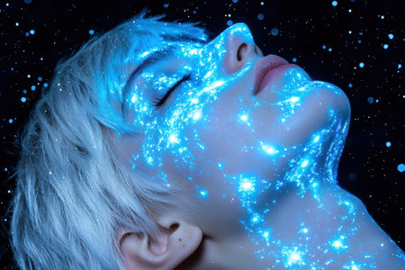 Closeup of a woman's face with glowing blue paint, resembling a nebula or galaxy