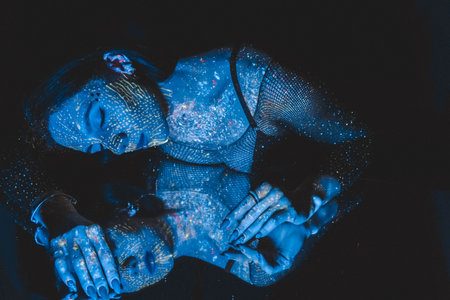 Portrait of a beautiful woman with blue glitter on her face.