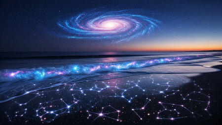 A surreal cosmic beach scene with a galaxy wave and constellations reflected on wet sand.