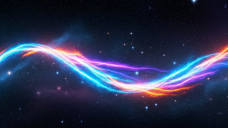 A vibrant cosmic energy wave with blue, purple, and orange streaks in a starry space background.