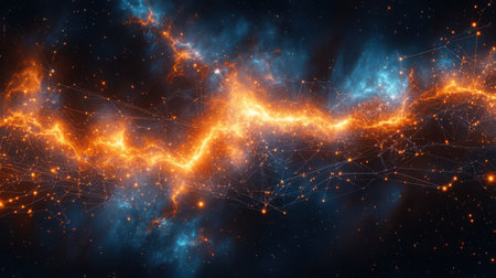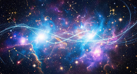 A vibrant celestial nebula with brilliant blue and purple gases illuminated by countless stars. Intricate glowing energy lines connect constellations across the vast expanse of the cosmos, representing universal connections and scientific discovery.