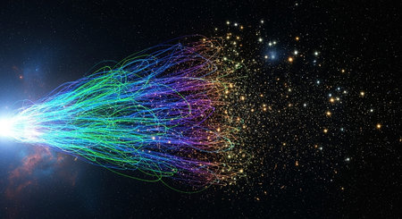 Dynamic and colorful particle collision in the vastness of space, featuring vibrant cosmic patterns, flowing energy, and galactic elements of physics and astronomy