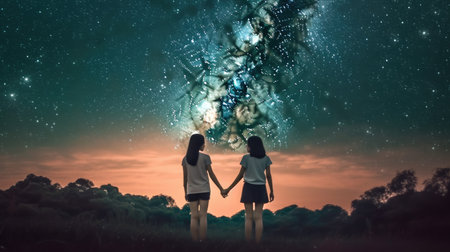 Couple of pretty girls holding hands and looking at abstract cloud. Mixed media