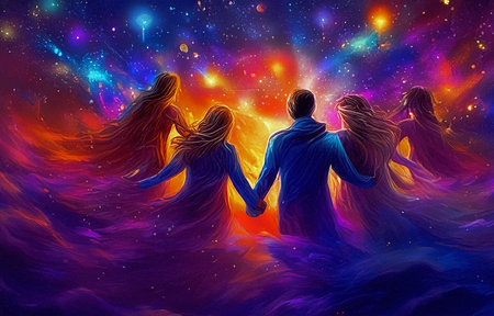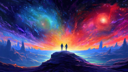 A captivating image featuring silhouetted figures immersed in a radiant, multi-colored space, evoking a sense of wonder and exploration.